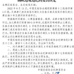 体坛周报全媒体原创 日前,中国足协开出罚单,长春亚泰的孙捷和天津津门虎的杨帆均被罚款5万元停赛5场,成为中超本赛季至今...